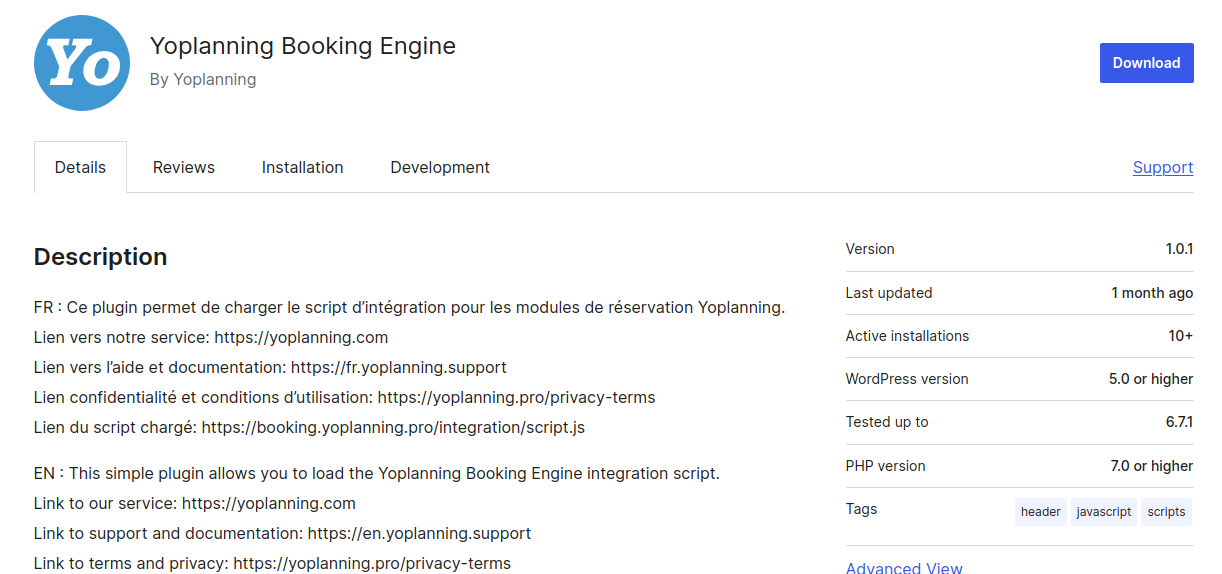 Su Wordpress è disponibile un plugin Yoplanning, accessibile a questo indirizzo: [wordpress.org/plugins/yoplanning-booking-engine/](https://wordpress.org/plugins/yoplanning-booking-engine/)